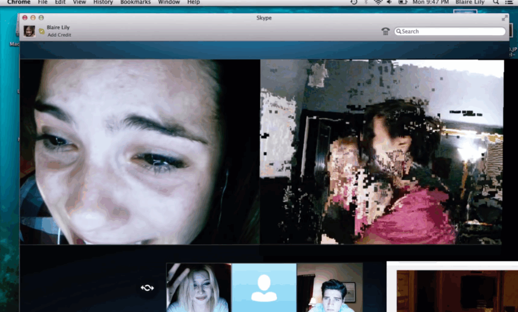 Unfriended vient donc expérimenter la question du glitch de la même manière que Cloverfield expérimentait les soubresauts des mouvements amateurs vidéos pour faire table rase du cadre classique à filmer des motifs spectaculaires depuis les images informatives et retranscrites en continu des événements des Tours jumelles. Et tout en chorégraphiant la panique générale des mouvements de foule dans cette habile variation de King Kong et autres Godzilla. Dans le cinéma expérimental, les « glitches » qui déchiraient l’image, un peu à la façon des photogrammes agrandies issues de vieilles pellicules de Éric Rondepierre, sont omniprésents depuis l’ère numérique. On retiendra Blow Job de François Rabet (2008) et The Things de Ilich Castillo (2012). Ensuite la manipulation d’un média numérique soi-disant retrouvé (ou plutôt détourné) fait légion depuis une bonne dizaine d’années : on retiendra A story for the Modlins de Sergio Oksman (2012), Say something about you de Camille Richou (2013) et la plupart des films de Fabien Rennet. Et enfin les compilations critiques des témoignages désespérés et désespérants des internautes : Because we are visual de Olivia Rochette et Gerard-Jan Claes et les films du collectif franco-allemand Neozoon (1).