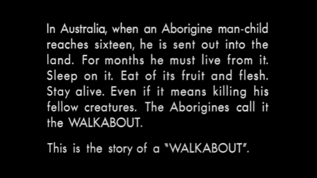 « En Australie, quand un Aborigène atteint 16 ans, il est envoyé dans la nature. Pendant des mois, il doit y survivre. Y dormir. S’en nourrir. Rester en vie. Même s’il lui faut pour cela tuer d’autres êtres vivants. Les Aborigènes appellent ça le walkabout. Voici l’histoire d’un walkabout. » (Panneau informatif et introductif du film)