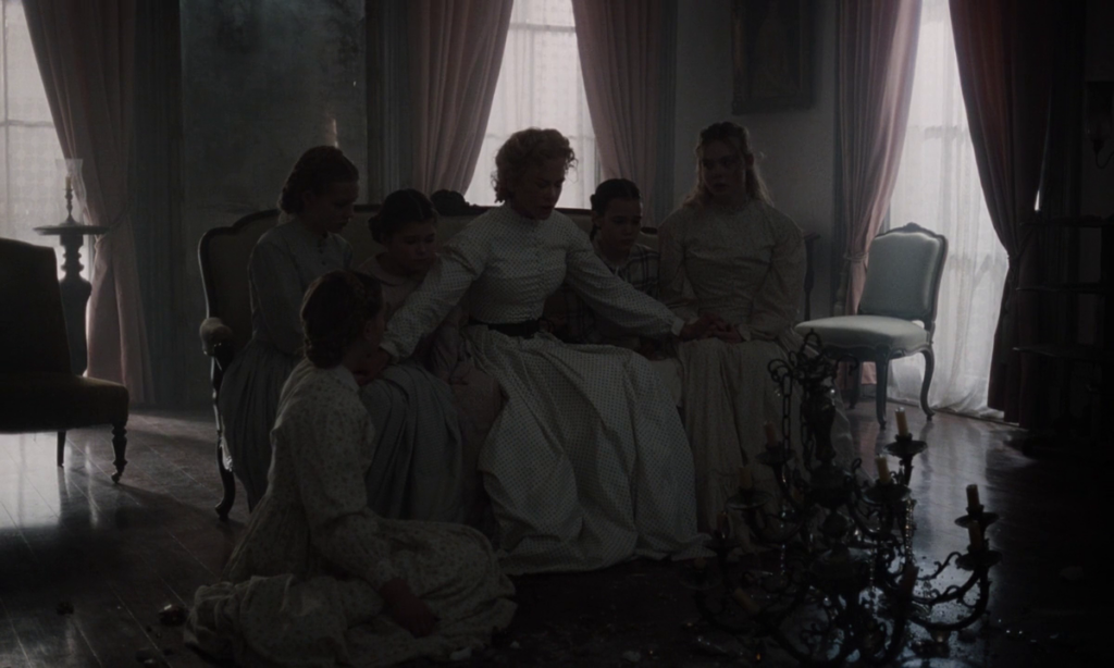 La configuration spatiale du pensionnat, protégé notamment par sa grille et la verdure envahissante de la propriété mal entretenue, les coupe du monde, telle la frontière symbolique et infranchissable de certaines forêts dans les contes. Leur entre-soi entretient ensuite cette coupure sociale avec le reste du monde et atrophie cette régression morale jusqu’à la barbarie, et ce malgré les apparences de civilité ou de de fragilité que toutes ces jeunes femmes semblent induire. Avec Les Proies, on est proche de la complicité criminelle à venir des enfants du film Le Marin qui abandonna la mer (1976, Lewis John Carlino) d’après Yukio Mishima, ou celle plus politique et revancharde du film Les révoltés de l’an 2000 (Narciso Ibañez Serrador, 1976). Des êtres a priori innocents commettent le crime parfait dans la mesure où on les assigne vulnérables, innocents, fragiles, mignons. Il faut voir comment elles enterrent la jambe de McB avec une « joyeuserie » macabre digne de The Wicker Man (Robin Hardy, 1973) et de sa « folie » collective pour s’en convaincre. Le groupe féminin des Proies n’est pas autre chose qu’un clan tribal bien cruel et digne de Sa Majesté des mouches (adapté de William Golding par Peter Brook en 1963). Les barbares ne sont décidément jamais ceux que l’on croit.