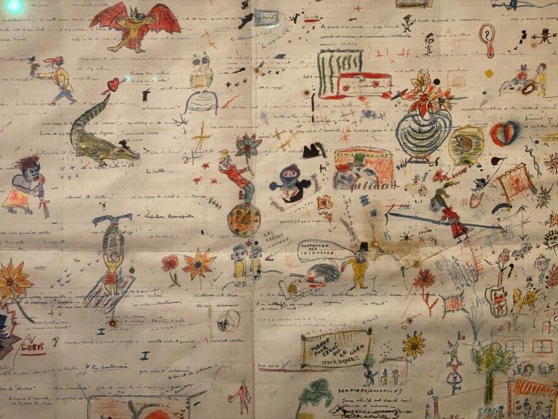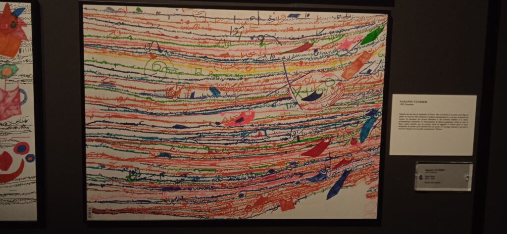 « Ce qui saisit le regard ici, c’est d’être à la fois en face d’une « partition » de couleurs et d’une sorte d’écriture dont les lignes deviennent des fils mystérieux se rejoignant (ou pas) d’où émanent quelques formes semblables à des hiéroglyphes ou à des symboles très personnels à son auteur. » (D.W)