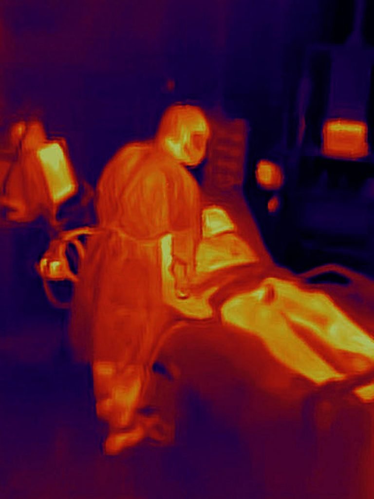 Pendant le confinement, Antoine d’Agata réalise deux séries de photographies à la caméra thermique, dans les rues et à l’hôpital. Il s’approprie ainsi une technologie de surveillance et de reconnaissance conçue à des fins scientifiques et militaires. Ces photographies d’un nouveau genre témoignent de la solitude forcée par l’interdiction des contacts physiques, mais aussi du soin porté aux personnes hospitalisées pendant cette période. il en résulte des images aux contours flous, presque brûlés. Les traits des visages sont comme avalés par la lumière émanant des radiations infrarouges. Les corps s’en trouvent tout à la fois anonymisés et sublimés. » (Cartel de l’œuvre dans le cadre de l’exposition « Dans le flou » au musée de l’Orangerie, Paris, 2025)