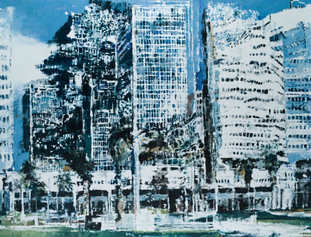 La technique singulière de Philippe Cognée consiste à reproduire des images photographiques en utilisant une peinture encaustique de pigments mêlés à de la cire d’abeille. La cire est ensuite fondue par endroits à l’aide d’un fer à repasser, les formes se dissolvent et l’image se floute, laissant apparaître le motif initial dans une morphologie nouvelle et trouble. Le sujet – souvent banal – bascule alors vers une autre représentation qui se dote d’une dimension tragique. Appartenant à une série plus large consacrée aux architectures contemporaines, Métamorphose I propose une vision précaire de nos environnements urbains surpeuplés. Image métaphorique d’un monde au bord de l’effondrement. » (Cartel de l’œuvre dans le cadre de l’exposition « Dans le flou » au musée de l’Orangerie, Paris, 2025)
