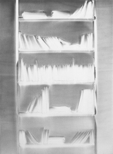 Le travail de Parmiggiani s’inscrit dans la lignée de l’Arte Povera, mouvement italien des années 1960 dont les moyens de création s’opposent à la logique productiviste de la société de consommation. En créant un feu contrôlé, l’artiste laisse ici se former une fine pellicule de suie sur les étagères de sa bibliothèque recouverte d’ouvrages. Une fois le mobilier enlevé, se dessine en négatif une empreinte aux contours vaporeux. « Il ne restait que les ombres des choses, presque les ectoplasmes de formes disparues, évanouies, comme les ombres des corps humains vaporisés sur les murs d’Hiroshima. » » (Cartel de l’œuvre dans le cadre de l’exposition « Dans le flou » au musée de l’Orangerie, Paris, 2025)