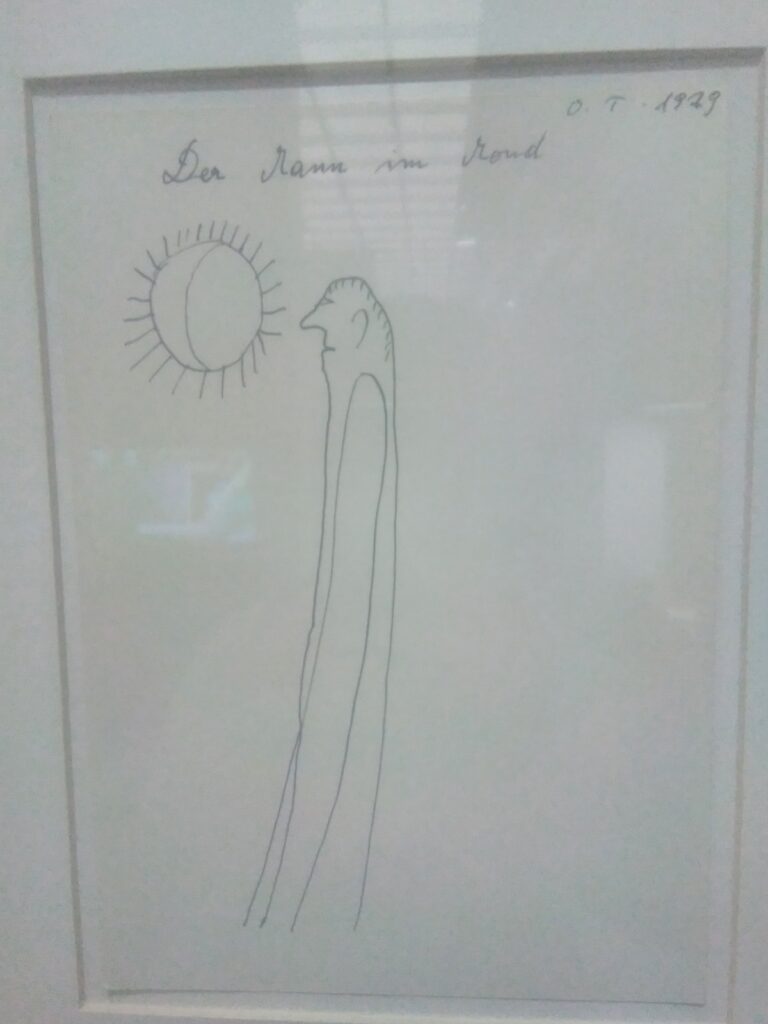 « Avec un trait précis, Oswald Tschirtner représente des figures filiformes dont le corps est réduit à l’épure. Oswald Tschirtner est élevé dans un milieu catholique d’une grande rigidité. Mobilisé durant la Seconde Guerre mondiale, il en ressort brisé. Interné en 1946, c’est en 1954 qu’il entre à l’hôpital psychiatrique de Gugging. Il ne dessine que si on le lui demande. » Cartel pour l’exposition L’Art Brut au Grand Palais, 2025.