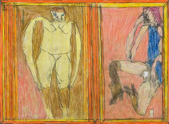 « Josef Hofer mêle une expression d’apparence enfantine au geste de l’exhibitionniste. Souffrant d’un handicap mental, sourd et quasiment muet, Josef Hofer se tourne vers le dessin. Depuis 1992, il vit dans une institution spécialisée où, dans sa chambre, il a installé un miroir lui permettant de dessiner son reflet. Sans Titre, vers 2010. Crayon gras et mine graphite sur papier. » Cartel pour l’exposition L’Art Brut au Grand Palais, 2025