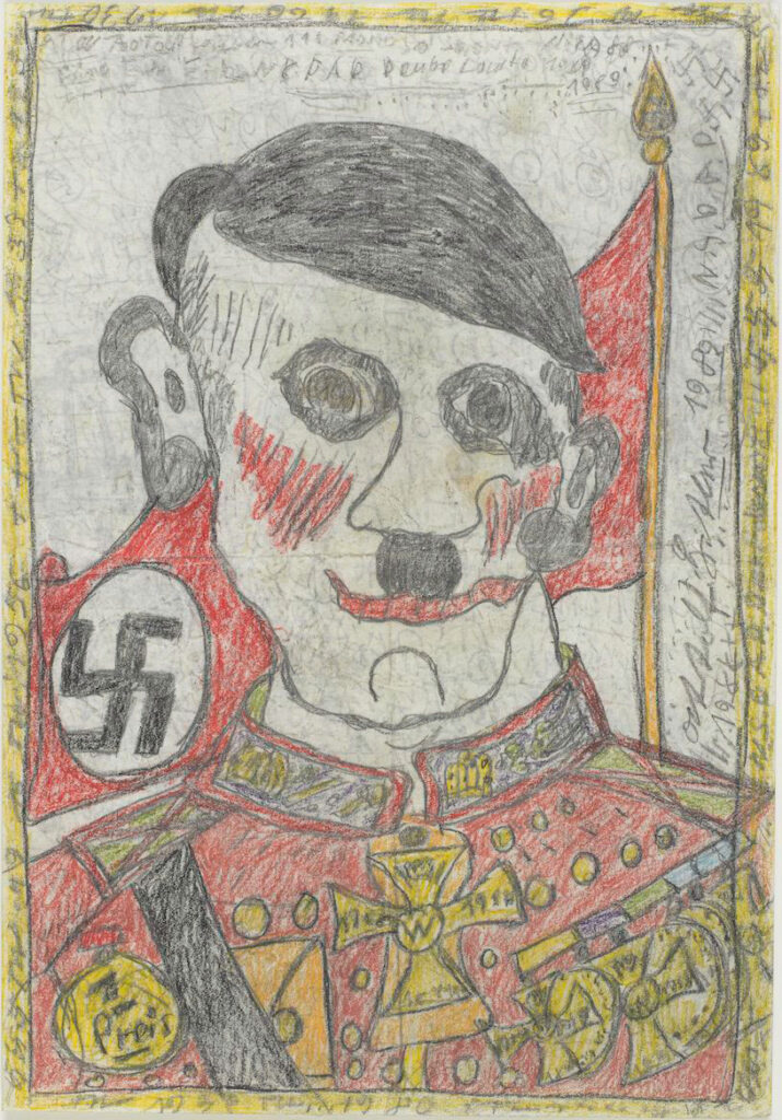 « Theo Wagemann représente ses bourreaux, notamment Adolf Hitler. Quasi mutique depuis un épisode traumatique survenu dans sa jeunesse, Theo Wagemann échappe à l’extermination des « malades mentaux » par les nazis, mais il est victime d’une stérilisation forcée. Interné à 61 ans, il commence à dessiner des dignitaires nazis, des catholiques, des prophètes bibliques, etc. Sans titre, vers 1989. Mine graphite et craie grasse sur papier. » Cartel pour l’exposition L’Art Brut au Grand Palais, 2025.